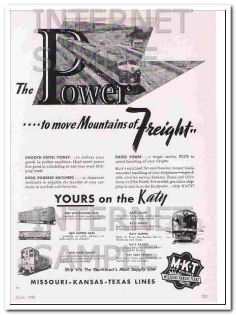 Original vintage industrial magazine ad, MISSOURI-KANSAS-TEXAS LINES. M-K-T Katy Railroad. The Power to Move Mountains of Freight, Smooth Diesel Power, Diesel Powered Switchers, Radio Power. Katy Bullet, Komet, Klipper, Packer, 72 Fast Freight. trains. Old 1948 railroad industry advertisement.