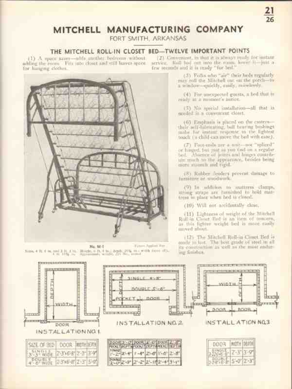 Original furniture trade vintage catalog for MITCHELL MANUFACTURING COMPANY, was located in Fort Smith, AR. Manufacturers of The Mitchell Roll-In Closet Bed. Twelve Important Points. No. M-1 shown. Disbound from a large 1938 home furniture catalog, this unique old one page technical brochure would display fantastic matted and framed. A marvelous addition to your retro furniture library.