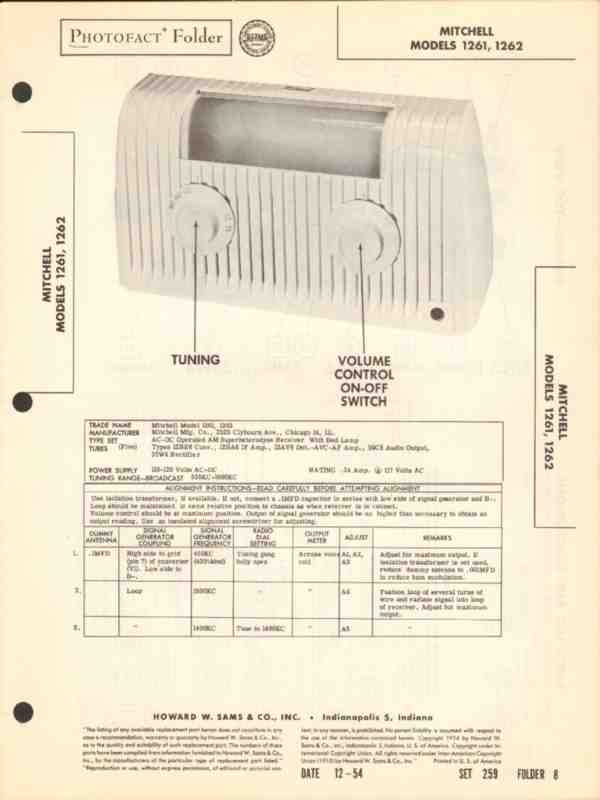 Vintage MITCHELL models 1261 and 1262 5 tube Superheterodyne AM radio receiver. Original old Sams Photofact manual includes schematic, layout, alignment instructions, voltage & resistance test chart, repair parts list and description. 2 pages. Dated 1954. Mitchell Manufacturing Company, of Chicago, IL. This manual would make a sensational accompaniment to your classic radio equipment.