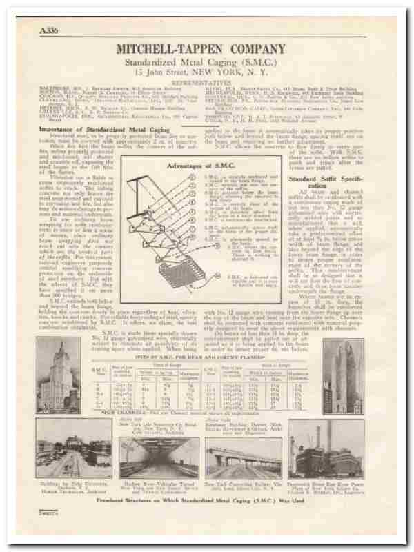 Original roofing trade vintage catalog for MITCHELL-TAPPEN COMPANY. Main office was located at 15 John Street, New York City, NY. Manufacturers of Standardized Metal Caging. Securely anchored and locked to beam flange, protected from fire or corrosion by 2 inches of concrete. Used on New York Life Insurance Company Building, New York City. Cass Gilbert, Architect. Buildings for Duke University, Hudson River Vehicular Tunnel, New York and Connecting Railway Viaduct, Long Island City, NY. Unbound from a large 1931 architectural catalog, this unique old one page technical brochure would display beautifully matted and framed. Nice graphics. A wonderful addition to your retro roofing construction library.