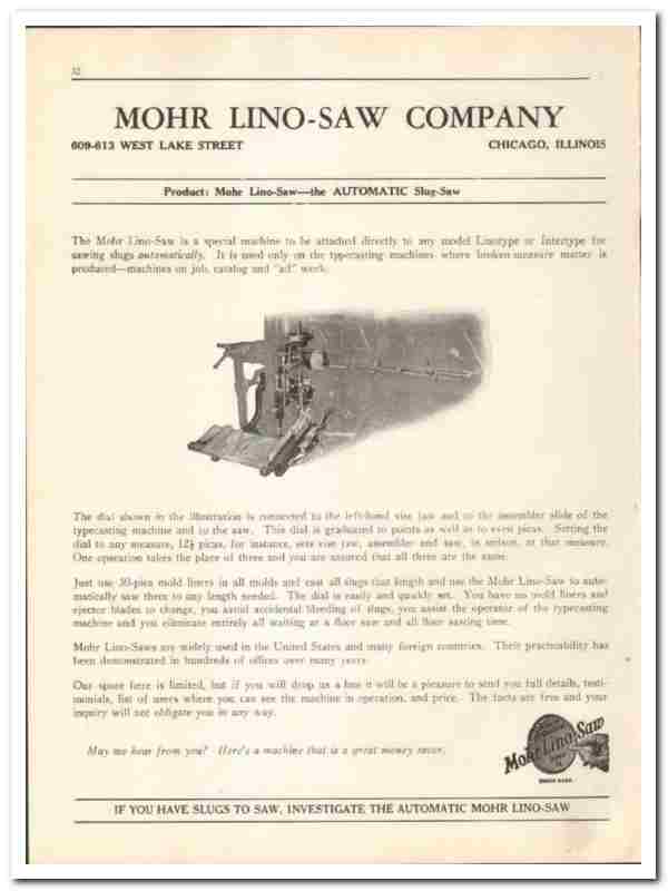 The Mohr Lino-Saw is a special machine to be attached directly to any model Linotype or Intertype for sawing slugs automatically. It is used only on the typecasting machines where broken-measure matter is produced; machines on job, catalog and 'ad' work.