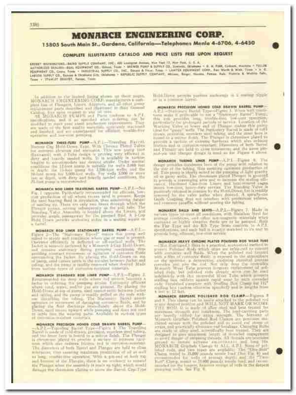 In addition to the limited listing shown on these pages, Monarch Engineering Corporation manufacturers a complete line of Plungers, Liners, Adapters and all other pump replacement parts described and illustrated in the General Catalog, free upon request to any oil man. All Monarch Pumps and Parts conform to A.P.I. specifications, and if so specified when ordering can be modified to meet your exact production requirements. They are made of the best quality materials, accurately machined and finished, and are surpassed for efficient, trouble-free operation and low-cost pumping.