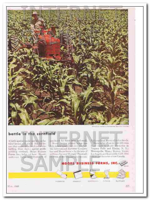 Original vintage industrial magazine ad, for MOORE BUSINESS FORMS INC. of Niagara Falls, NY. Battle In The Cornfield against weeds and profit gobbling overhead. Moore designs printed forms that help reduce squandered clerical effort. Photograph courtesy of International Harvester Company. Old dated 1948 industry advertisement. (The scan shows a slight pink tint that is not on the actual ad.)