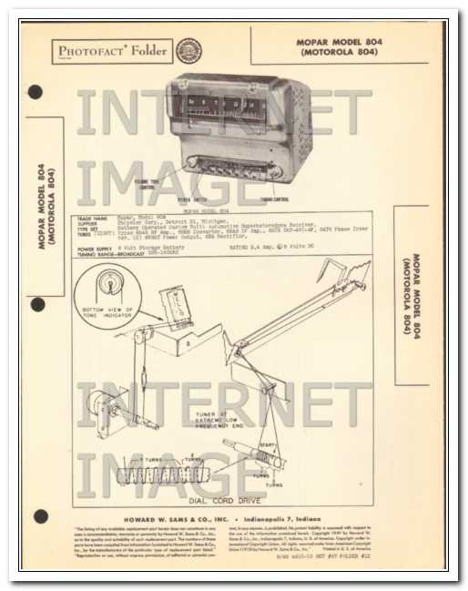 Vintage MOPAR model 804 (Motorola 804) 8 tube Superheterodyne AM car radio receiver. Original old Sams Photofact manual includes schematic, layouts, alignment info, voltage test chart, repair parts list. 6 pages. Dated 1949. Chrysler Corp., of Detroit, MI.