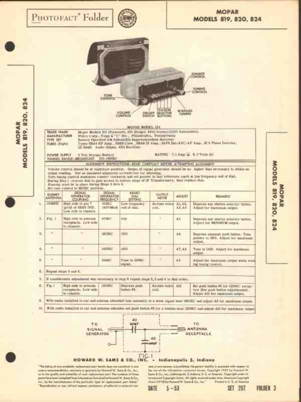 Vintage MOPAR models 819, 820 and 824 8 tube Superheterodyne AM car radio receiver. Original old Sams Photofact manual includes schematic, layout, alignment instructions, voltage & resistance test chart, repair parts list. 6 pages. Dated 1953. Philco Corp. of Philadelphia, PA.