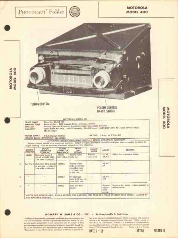 Vintage MOTOROLA model 400 6 tube Superheterodyne AM car radio receiver. Original old Sams Photofact manual includes schematic, layouts, alignment info, voltage test charts, repair parts list. 4 pages. Dated 1950. Motorola Inc. of Chicago, IL.