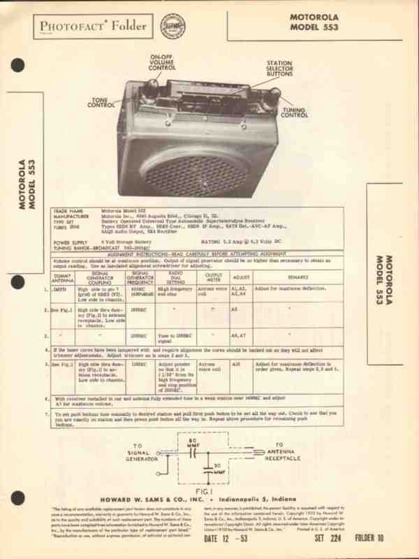 Vintage MOTOROLA model 553 6 tube Superheterodyne AM car radio receiver. Original old Sams Photofact manual includes schematic, layout, alignment instructions, voltage & resistance test chart, repair parts list. 4 pages. Dated 1953.