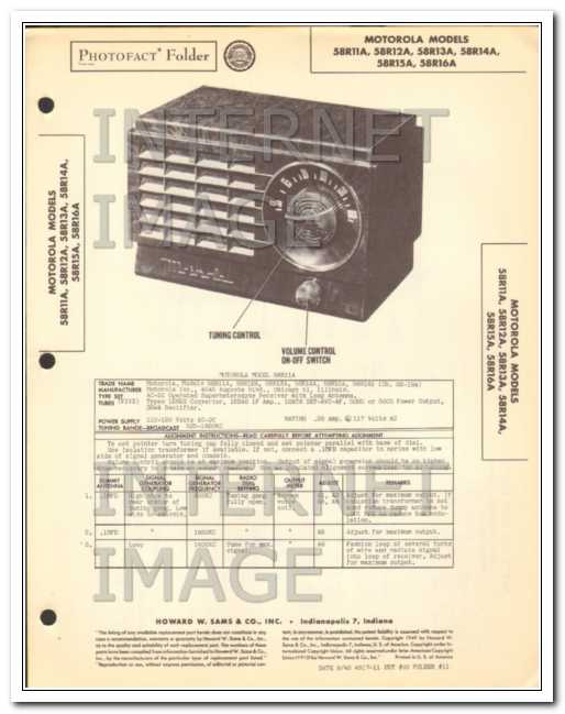 Vintage MOTOROLA models 58R11A, 58R12A, 58R13A, 58R14A, 58R15A and 58R16A 5 tube Superheterodyne AM radio receiver. Original old Sams Photofact manual includes schematic, layouts, alignment info, repair parts list. 4 pages. Dated 1949.