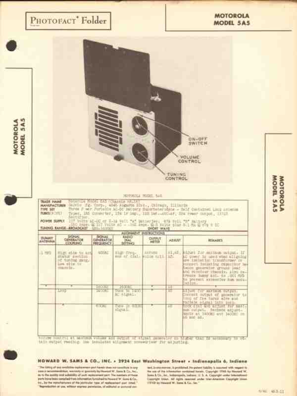 motorola model 5a5 5 tube am radio receiver sams photofact manual