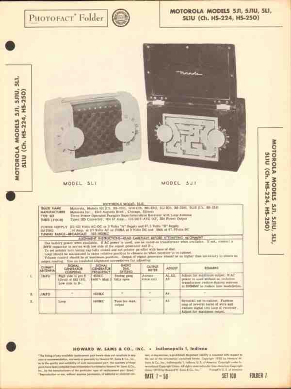 Vintage MOTOROLA models 5J1, 5J1U, 5L1 and 5L1U (Ch. HS-224, HS-250) 4 tube Superheterodyne AM radio receiver. Original old Sams Photofact manual includes schematic, layouts, alignment info, repair parts list. 4 pages. Dated 1950. Motorola Inc. of Chicago, IL. This manual would make a sensational accompaniment to your vintage audio equipment.
