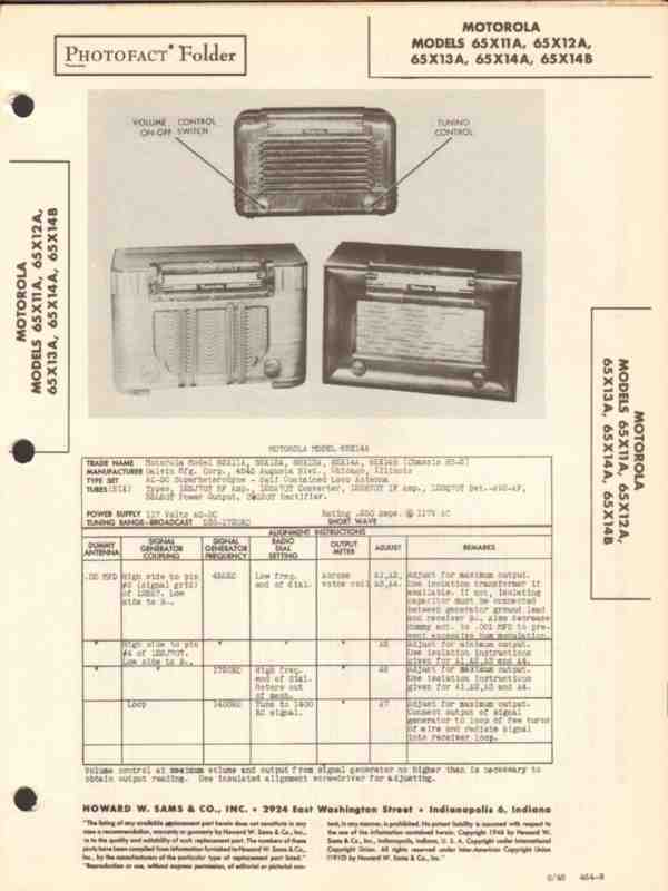 Vintage MOTOROLA models 65X11A, 65X12A, 65X13A, 65X14A and 65X14B Superheterodyne 6 tube AM radio receiver. Original old Sams Photofact manual includes schematic, layout, alignment instructions, voltage & resistance test charts, repair parts list and description. Dated 1946. 4 pages. Galvin Manufacturing Corp., of Chicago, IL. This manual would make a sensational accompaniment to your classic retro radio equipment.