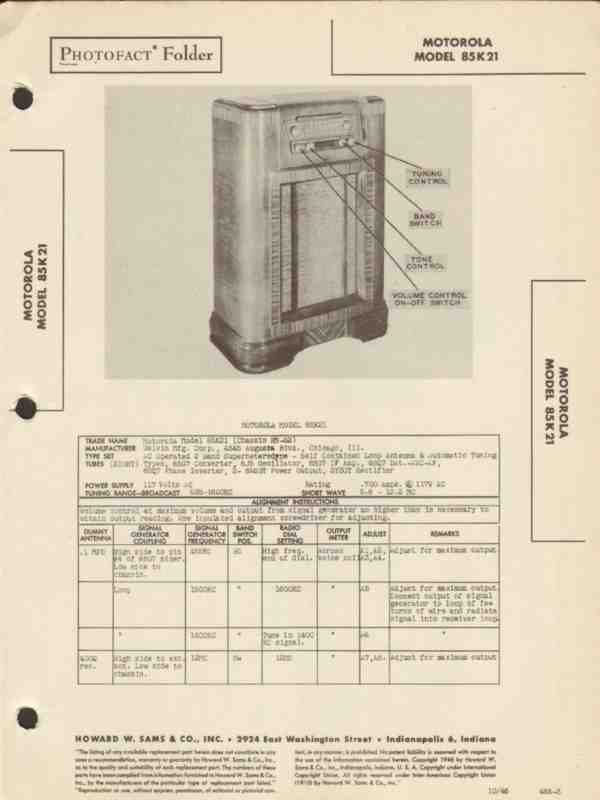 motorola model 85k21 am sw radio receiver sams photofact manual