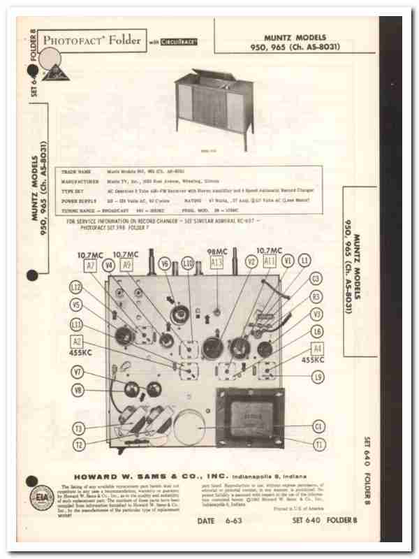Vintage MUNTZ models 950 and 965 (Chassis AS-8031) 8-tube AC operated AM FM radio receiver with stereo amplifier and 4 speed automatic record changer. Original old Sams Photofact manual includes fold-out schematic, parts layout, alignment instructions, voltage & resistance test chart, repair parts list and description. 8 pages. Dated 6-1963. Manufactured by Muntz TV, Inc, of Wheeling, IL. This manual would make a sensational accompaniment to your retro audio equipment.