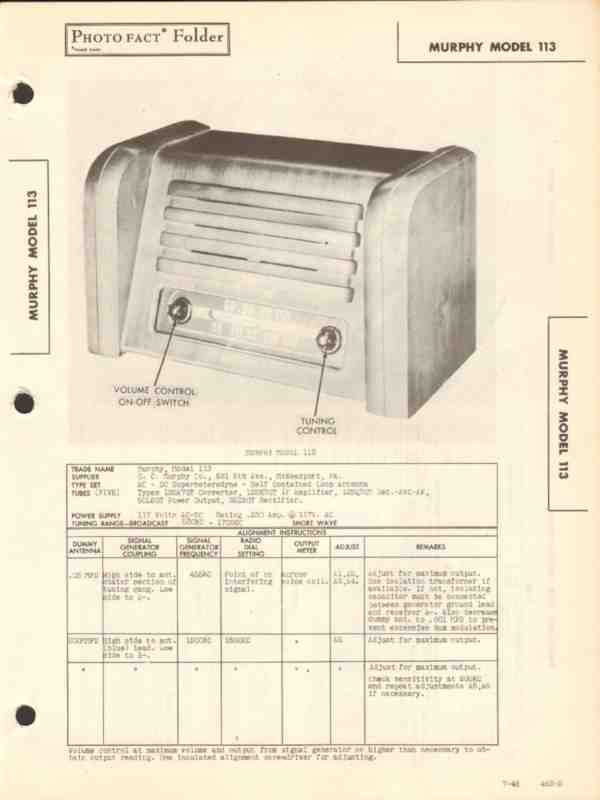 Vintage MURPHY model 113 Superheterodyne 5 tube AM radio receiver. Original old Sams Photofact manual schematic layout alignment info repair parts list. Dated 1946. 4 pages. G. C. Murphy Co., of McKeesport, PA. This manual would make a sensational accompaniment to your classic retro radio equipment.