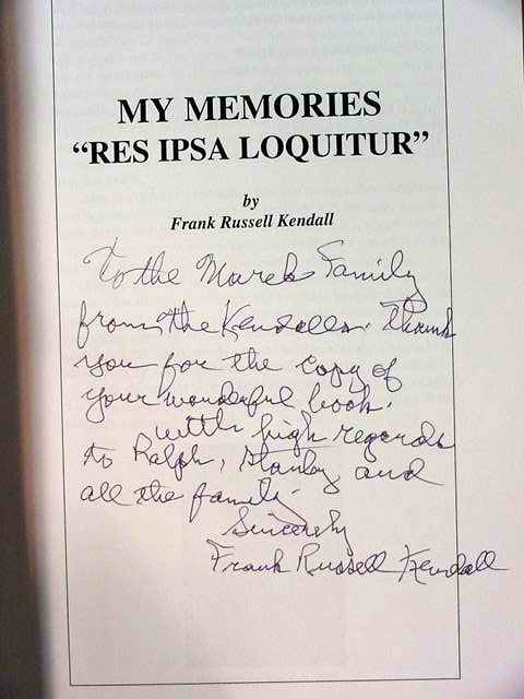 Hard covered book titled MY MEMORIES "Res Ipsa Loquitur" Signed & Inscription by Frank Russell Kendall, 2000, 180 pages, printed by Ajalon Printing & Design.