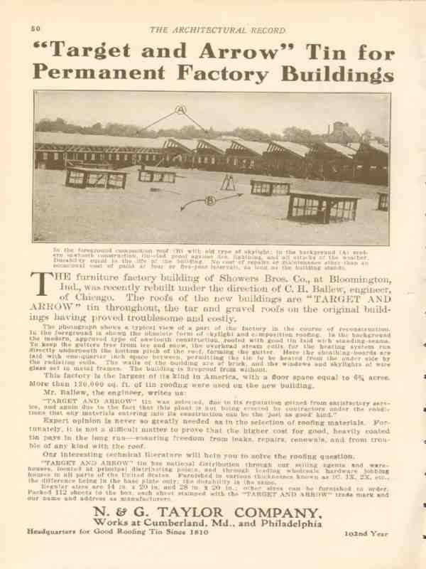 Original vintage architectural trade magazine ad for N. & G. TAYLOR COMPANY of Philadelphia, PA. The furniture factory building of Showers Brothers Company at Bloomington, IN was recently rebuilt under the direction of C. H. Balew, engineer. The roofs of the new buildings are Target and Arrow Tin throughout. Old 1911 building construction industry advertisement.