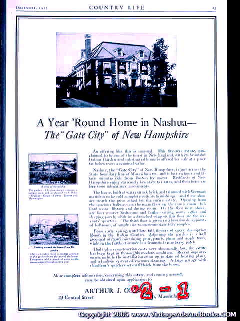 Original vintage magazine ad, A YEAR ROUND HOME IN NASHUA - The "Gate City" of New Hampshire for sale by Arthur Conlon Realtors. Five acres estate, on of the finest in New England, with beautiful country home and Italian Garden. Old 1925 dated Nashua, NH. real estate advertisement.