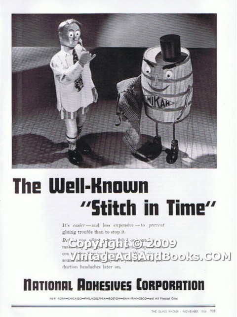 Original vintage magazine ad, NATIONAL ADHESIVES CORPORATION of New York City, NY. The Well-Known Stitch in Time. It's easier and less expensive to prevent gluing trouble than to stop it. Before you adopt a new label or container, or make any changes in your gluing operations, consult our Service Department. Old 1938 glass industry advertisement.