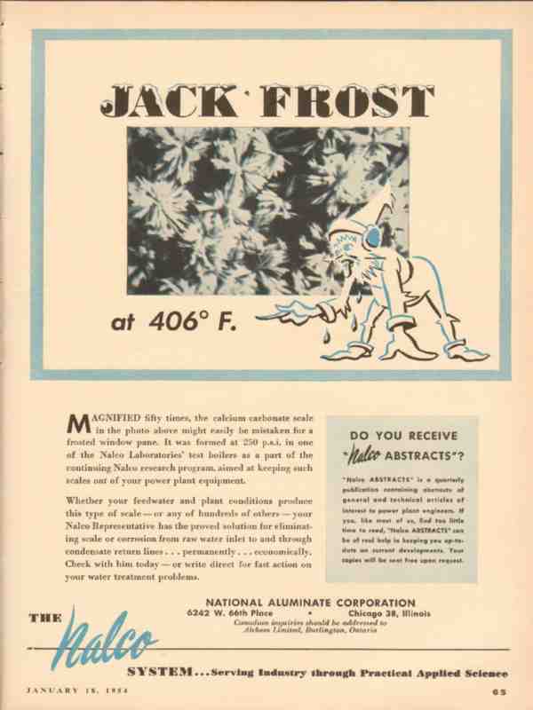 Original oil and gas trade magazine vintage ad for NATIONAL ALUMINATE CORPORATION, was located at 6242 West 66th Place, Chicago, IL. Jack Frost Calcium Carbonate Scale. Feedwater and Plant Conditions. Unique 1954 old petroleum petrochemical industry magazine advertisement. Nice graphics.