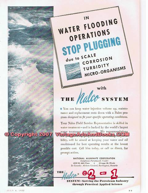Original oil and gas trade magazine vintage ad for NATIONAL ALUMINATE CORPORATION, was located at 6242 West 66th Place, Chicago, IL. In Water Flooding Operations Stop Plugging do to Scale Corrosion Turbidty Micro-Organisms with The Nalco System. This unique 1955 old oilfield petroleum industry magazine advertisement would look fantastic matted and framed.