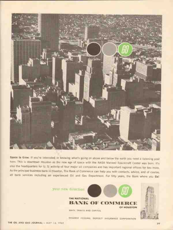 Original old petroleum banking and fincial industry trade magazine ad for THE NATIONAL BANK OF COMMERCE of Houston, TX.  Space To Grow.  Downtown Houston as the new age of space with the NASA Manned Spacecraft Center was born.  Headquarters of U.S. activity of four major oil companies. This 1962 oil and gas industry banking magazine advertisement would display beautifully matted and framed.