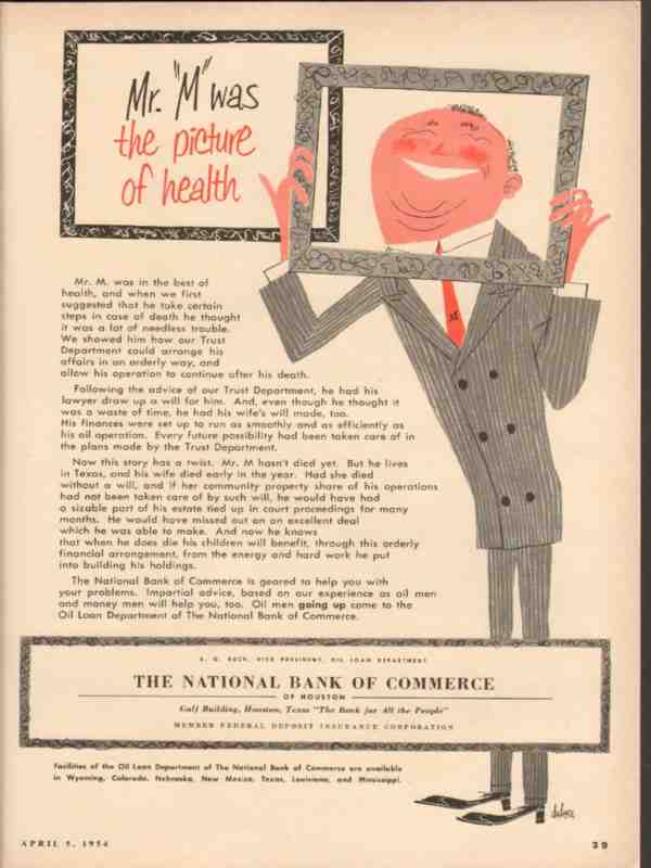 Original vintage oil and gas trade magazine ad for THE NATIONAL BANK OF COMMERCE of Houston, TX. Mr. M Was the Picture of Health. We showed him how our Trust Department could arrange his affairs in an orderly way. Old 1954 petroleum industry oilfield and refinery advertisement.