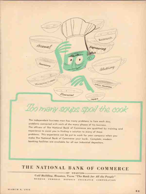 national bank of commerce 1954 houston tx too many soups vintage ad