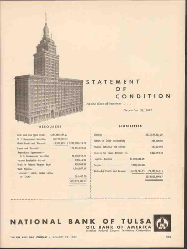 Original old oil and gas banking industry trade magazine vintage ad for NATIONAL BANK OF TULSA, OK. Statement of Condition at the Close of Business, December 31, 1961. Resources and Liabilities listed. This 1962 petroleum finance magazine advertisement would display beautifully matted and framed.