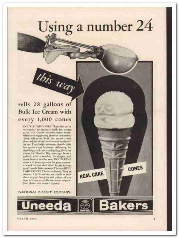 Original ice cream trade magazine vintage ad for NATIONAL BISCUIT COMPANY. Main office and factory was located at 449 West 14th Street, New York City, NY. Manufacturers of ice cream cones. Using a Number 24 Dipper for double dip cones. Sell 28 gallons of bulk ice cream with every 1000 real cake cones. Uneeda Bakers help customers double their cone business. This unique 1933 old dairy industry magazine advertisement would display wonderful matted and framed. Nice graphics.