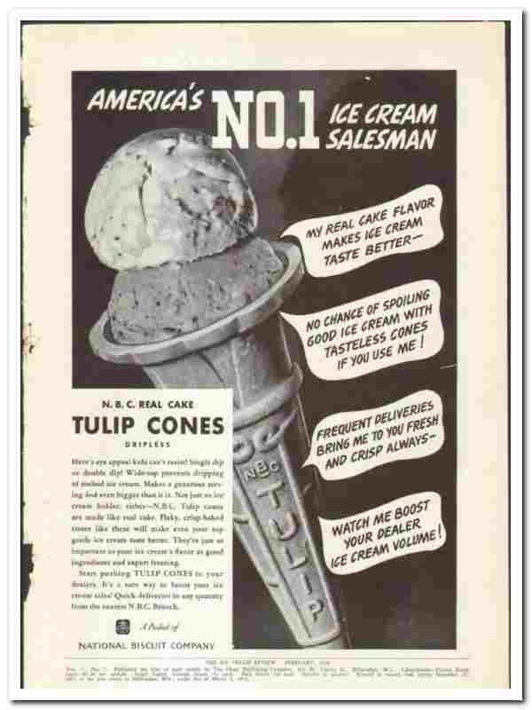 Manufacturers of N.B.C. Real Cake Tulip Cones for Ice Cream. 'America's No. 1 Ice Cream Salesman'.