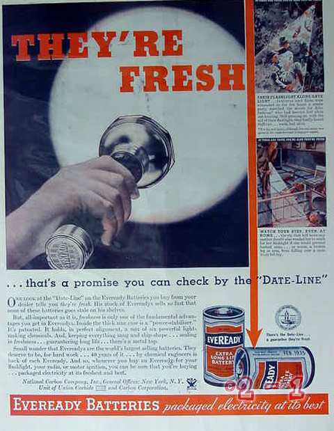 Original vintage magazine ad for NATIONAL CARBON COMPANY, INC. of New York City, NY. Unit of Union Carbide and Carbon Corporation. They're Fresh. Old 1934 EVEREADY flashlight batteries advertisement.