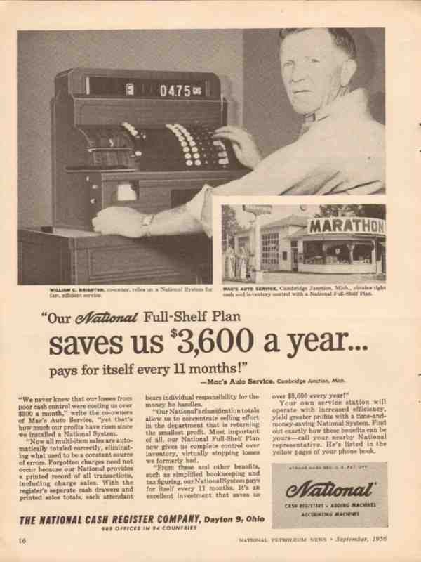 Original old retail petroleum trade magazine vintage ad for NATIONAL CASH REGISTER COMPANY of Dayton, OH. Mac's Auto Service owned by William C. Brighton in Cambridge Junction, MI obtains tight cash and inventory control with a Full-Shelf Plan. This unique old 1956 oil and gas advertisement would display beautifully matted and framed.