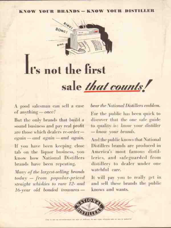 Original vintage whiskey, wine and spirits trade magazine ad for NATIONAL DISTILLERS. It's Not The First Sale That Counts! The only brands that build a sound business and pay real profit are those which dealer reorder again and again. Old 1934 rare Post Prohibition era advertisement.