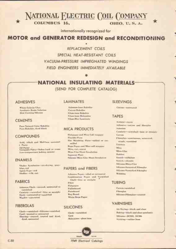 Original electrical trade vintage catalog for NATIONAL ELECTRIC COIL COMPANY, was located in Columbus, OH. Motors and Generators redesign and reconditioning. Replacement coils, vacuum-pressure impregnated windings. Disbound from a large 1949 electrical construction materials book, this unique old one page technical specifications brochure would display wonderfully matted and framed. A marvelous addition to your retro electric equipment library.