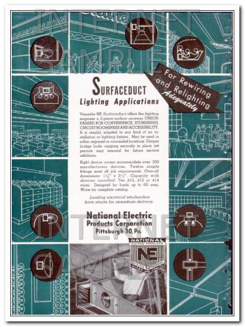 Original vintage magazine ad for NATIONAL ELECTRIC PRODUCTS CORPORATION of Pittsburgh, PA. SURFACEDUCT Lighting Applications. For Rewiring and Relighting Adequately. Old 1948 electrical industry advertisement.