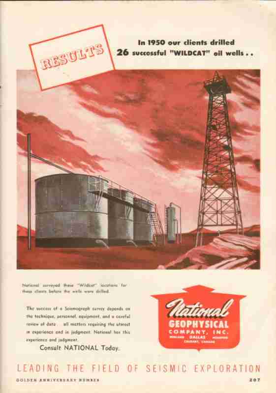 Original oil and gas trade magazine vintage ad for NATIONAL GEOPHYSICAL COMPANY, INC. of Dallas, TX, Midland, TX, Houston, TX. and Calgary, Canada. Seismic Exploration. In 1950, our clients drilled 26 successful Wildcat oil wells. This unique 1951 dated oilfield petroleum industry services magazine advertisement would look sensational matted and framed. Great graphics. Approximate size 9 x 12 inches.