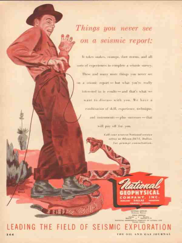 Original oil and gas trade magazine vintage ad for NATIONAL GEOPHYSICAL COMPANY, INC. of Dallas, TX.  Things You Never See on a Seismic Report. It takes snakes, swamps, dust storms, and all sorts of experiences to complete a seismic survey. Art work by Chas. Beale, features a rattlesnake getting ready to strike. This unique 1953 old oilfield petroleum exploration industry magazine advertisement would display beautifully matted and framed. Nice graphics.
