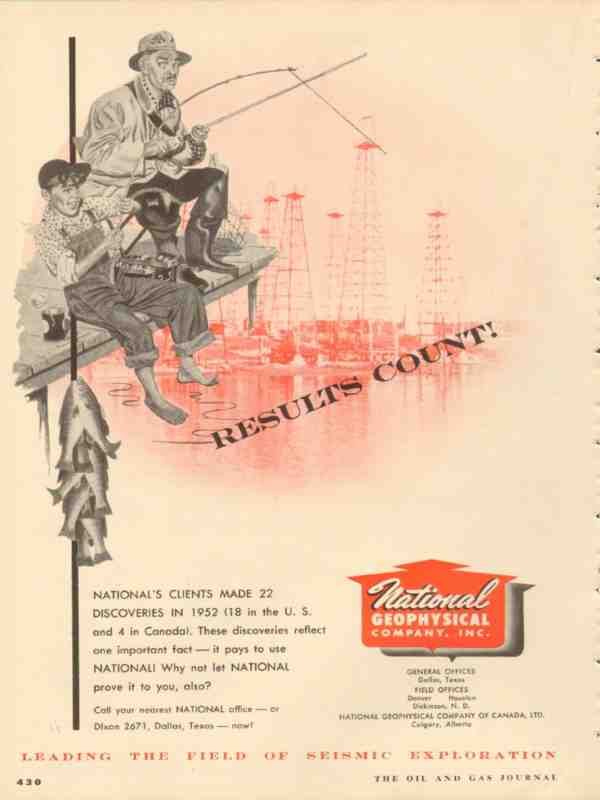 Original oil and gas trade magazine vintage ad for NATIONAL GEOPHYSICAL COMPANY, INC. of Dallas, TX. Results Count! Leading the Field of Seismic Exploration. Unique 1953 old oilfield petroleum industry magazine advertisement. Nice graphics.