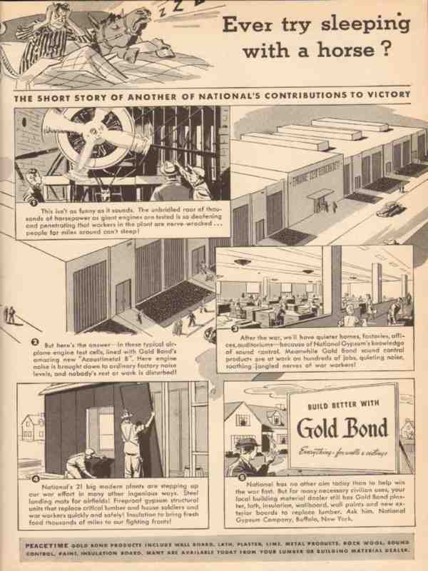 Original World War 2 building construction industry trade magazine vintage ad for NATIONAL GYPSUM COMPANY of Buffalo, NY. Every Try Sleeping With a Horse? The unbridled roar of thousands of horsepower as giant engines are tested is so deafening the penetrating that workers in the plant are nerve wracked and people for miles around can't sleep! National Gypsum's Gold Bond Sound Control Products are at work on hundred of jobs, quieting noise. Old 1943 WW2 wartime era propaganda magazine advertisement.