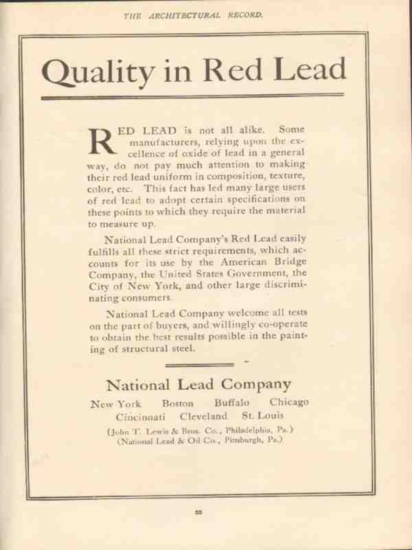 Original vintage architectural trade magazine ad for NATIONAL LEAD COMPANY. Quality in Red Lead is Not All Alike. The National Lead Company's Red Lead fulfills all strict requirements, which accounts for its use by the American Bridge Company, the United States Government, the City of New York, and other large discriminating consumers. Old 1910 building construction and design advertisement.