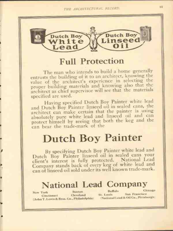 Original vintage architectural trade magazine ad for NATIONAL LEAD COMPANY. Full Protection. Dutch Boy Painter, White Lead, Linseed Oil Paint. Old 1912 building construction industry advertisement.