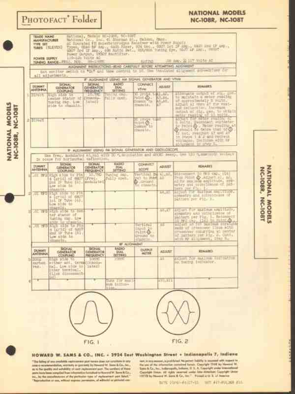 Vintage NATIONAL models NC-108R and NC-108T FM Superheterodyne radio receiver. Original old Sams Photofact manual includes schematic, layouts, alignment adjustments, repair parts list. 5 pages. Dated 1948. National Company Inc. of Malden, MA. This manual would make a sensational accompaniment to your vintage audio equipment.