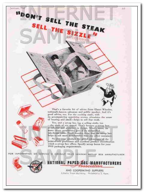 Original vintage industrial magazine ad, for And Coo NATIONAL PAPER BOX MANUFACTURERS ASSOCIATION and Coperating Suppliers of Philadelphia, PA. Don't Sell The Steak, Sell The Sizzle! Advice from Elmer Wheeler. Old dated 1948 industry advertisement. (The scan shows a slight pink tint that is not on the actual ad.)