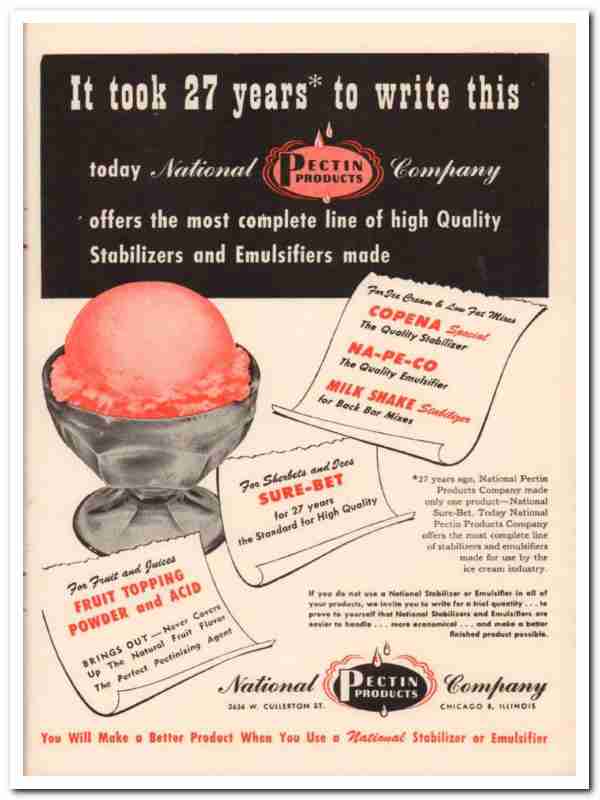 Original ice cream trade magazine vintage ad for NATIONAL PECTIN PRODUCTS COMPANY. Main office and plant was located at 2656 West Cullerton Street, Chicago IL. Manufacturers of ice cream stabilizers. It took 27 years to write this. Today, National Pectin Products Company offers the most complete line of high quality stabilizers and emulsifiers made. This unique 1952 old dairy industry magazine advertisement would display wonderful matted and framed. Nice graphics.