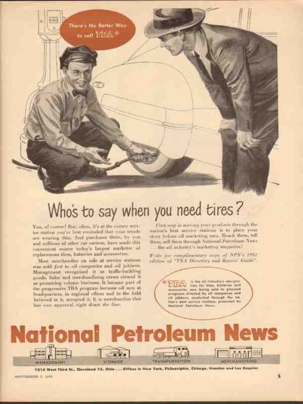 Original oil and gas service station media industry trade magazine vintage ad for NATIONAL PETROLEUM NEWS of Cleveland, OH. Who's To Say When You Need Tires? You of course. But often it's at the corner service station you're first reminded that your treads are wearing thin. Old 1952 petroleum marketing magazine advertisement.