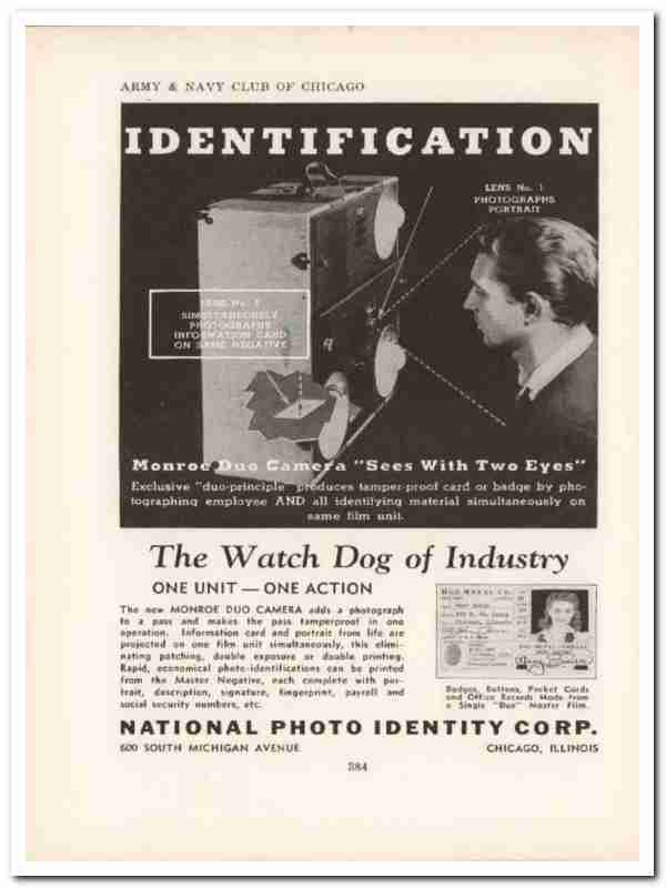 Original WW2 wartime camera vintage ad for NATIONAL PHOTO IDENTITY CORPORATION. Monroe Duo Camera sees with two eyes. Duo-principle produces tamper-proof card or badge by photographing employee and all identifying material simultaneously on the same film unit. Each complete with portrait, description, signature, fingerprint, payroll and social security numbers.