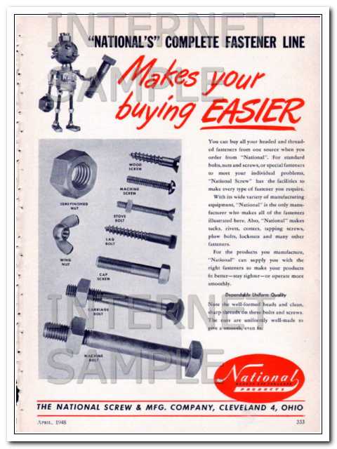 Original vintage magazine ad for NATIONAL SCREW AND MANUFACTURING COMPANY of Cleveland OH. National's complete Fastener Line. Makes your buying easier. Old 1948 industrial advertisement.