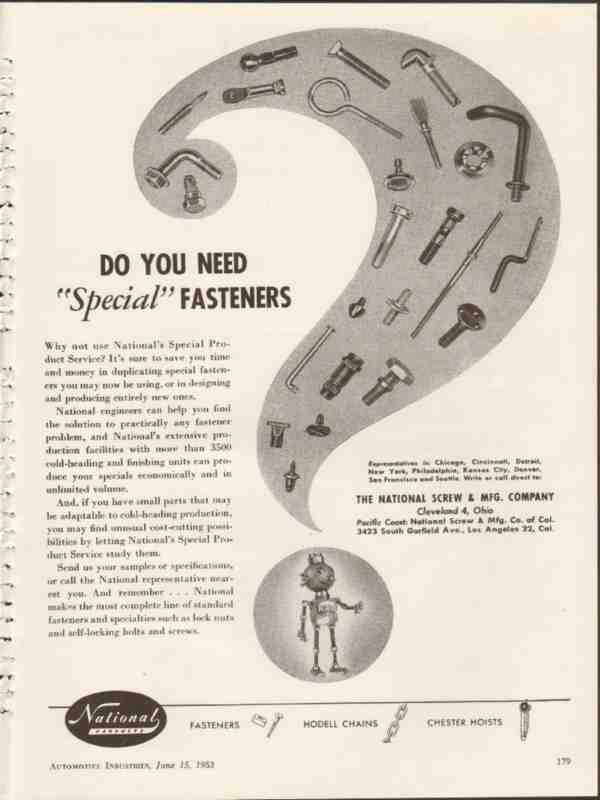 Original vintage automotive industries trade magazine ad for NATIONAL SCREW ANDMANUFACTURING COMPANY of Cleveland, OH. Do You Need Special Fasteners? Fasteners, Hodell Chains, Chester Hoists. Old 1953 industrial advertisement.