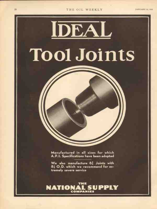 Original oil and gas trade magazine vintage ad for THE NATIONAL SUPPLY COMPANIES.  Ideal Tool Joints. Manufactured in all sizes. This unique 1931 old oilfield petroleum drilling industry equipment magazine advertisement would display beautifully matted and framed. Nice graphics.