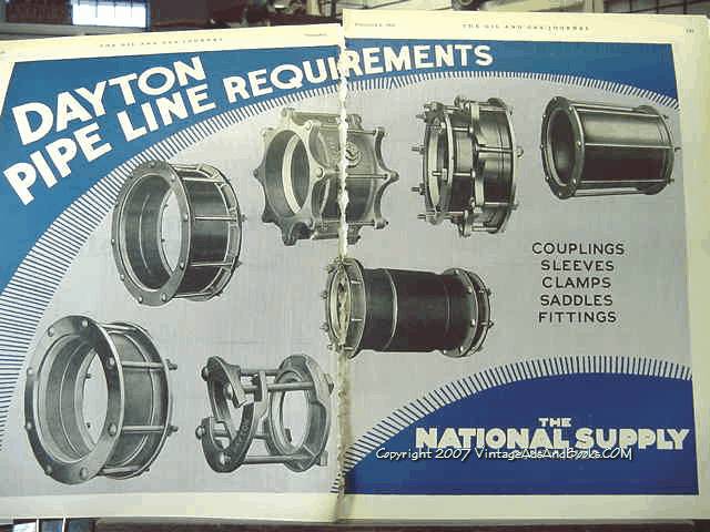 Original oil and gas trade magazine vintage ad for THE NATIONAL SUPPLY COMPANIES. Dayton Pipe Line Requirements. Couplings, Sleeves, Clamps, Saddles and Fittings. This unique 1928 old oilfield petroleum pipeline industry magazine advertisement would look fantastic matted and framed. Nice graphics. Two-page gatefold advertisement.